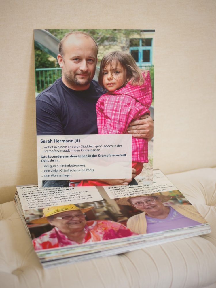 Wir unterstützen ein Nachhaltigkeits-Projekt der Uni Erfurt mit dem Druck von 15 Fotoplatten im Format A3. Diese werden im Rahmen des Straßenfestes „krämpf fresh“ am 12.07.2015 bei einer Foto-Ausstellung präsentiert. Jeder portraitierte Bewohner wurde von den Studierenden zu seinem Leben in der Krämpfervorstadt befragt.